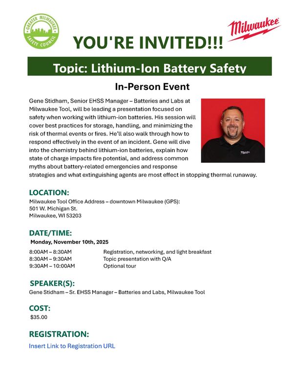 Please join us as guest speaker Gene Stidham informs us on safety while working with lithium-ion batteries and how to effectively respond in a thermal event.